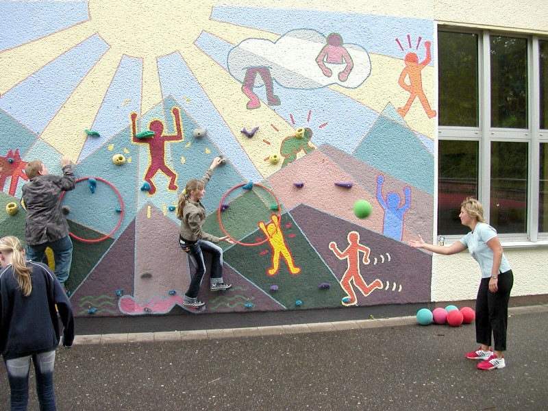 Etwa 2 Jahre dauerte es von der Idee bis zur Fertigstellung der neuen Kletterwand im Schulhof. Sicherheitsaspekte waren zu bedenken und technische Schwierigkeiten bei der Anbringung der Griffschalen an der Hauswand waren zu bewältigen. Manches Bohrloch erwies sich als falsch gesetzt, bis die Griffe schließlich in der richtigen Höhe mit Dübeln befestigt waren. Die Hausfassade wurde von einer Arbeitsgemeinschaft unter Leitung von Herrn Repp mit Motiven gestaltet und bemalt. Die Finanzierung lief verhältnismäßig unkompliziert. Die rund 2000 Euro an Kosten brachten der "Verein der Freunde des LGP" und die Schülervertretung auf.
