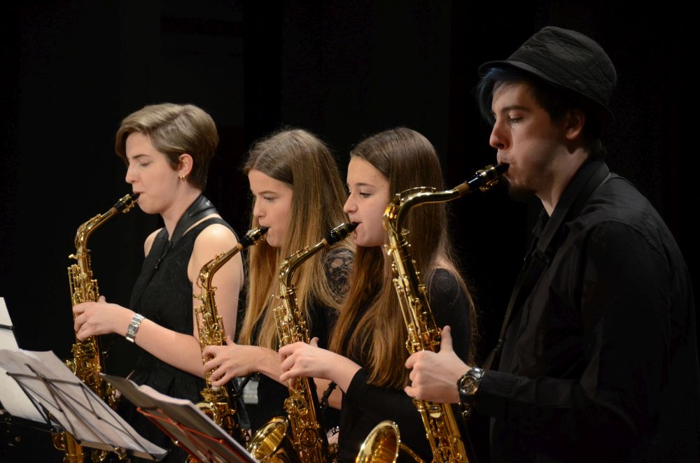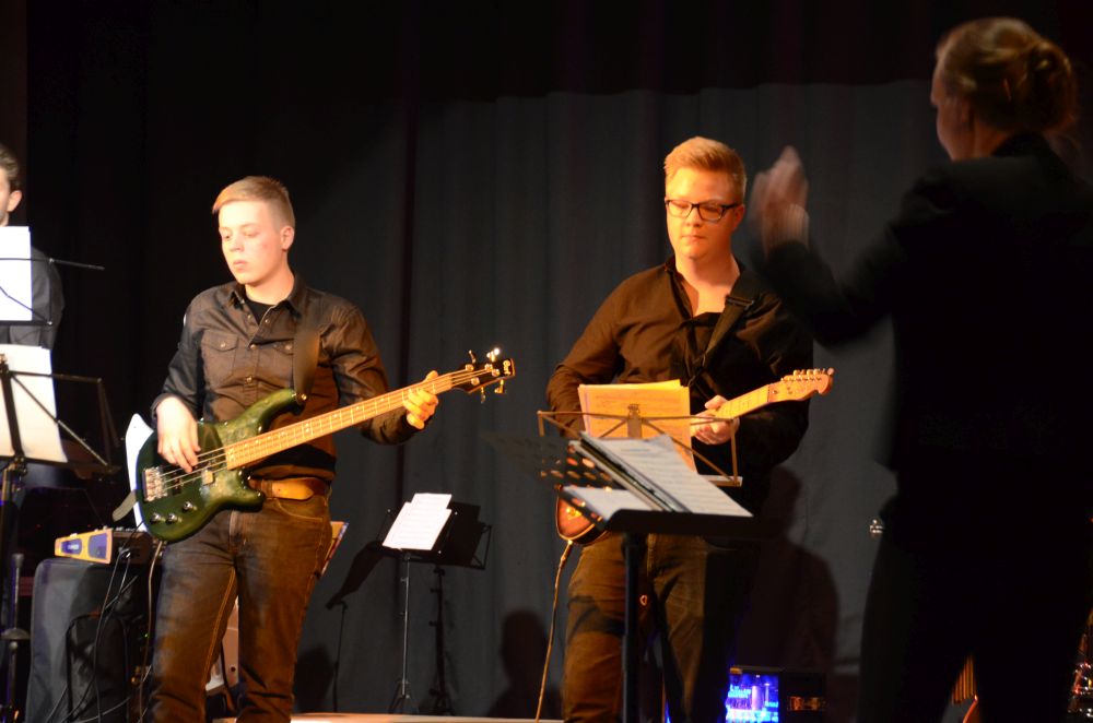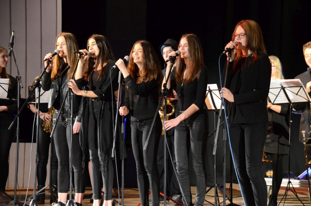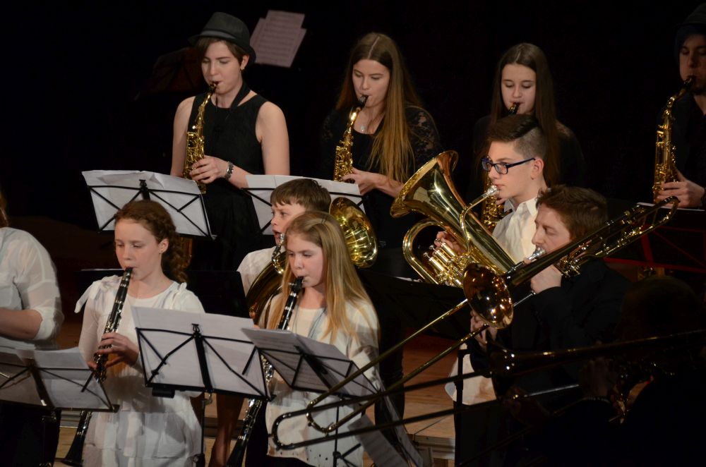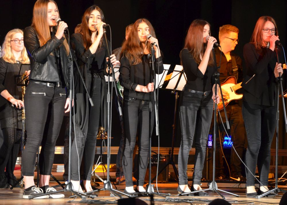 Direkt am Anfang des Abends stand die große, mit Spannung erwartete Premiere der Big-Band-Klasse. Dieses im Schuljahr 2016/2017 erstmals an unserer Schule realisierte Projekt ermöglicht es Schülerinnen und Schülern der 5. und 6. Klassen ein Instrument zu erlernen und das Zusammenspiel im Klassenverband zu trainieren. Nicht nur die sichtbare Spielfreude der rhythmisch wie dynamisch starken Truppe, sondern auch die nach den Neuanmeldungen garantierte Fortsetzung im nächsten Schuljahr bestätigen den Erfolg dieses Projekts.