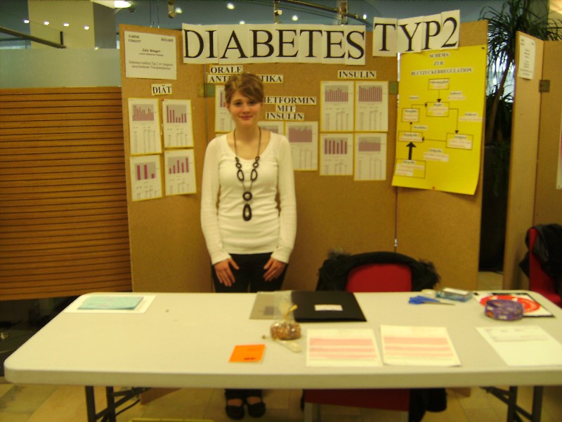 Den 1. Platz erreichte Julia Weigert mit dem Thema: "Diabetes mellitus Typ 2 im Vergleich verschiedener Therapieoptionen". Ziel war es herauszufinden, welche Therapieoption langfristig gesehen den bestmöglichen Erfolg bringt.