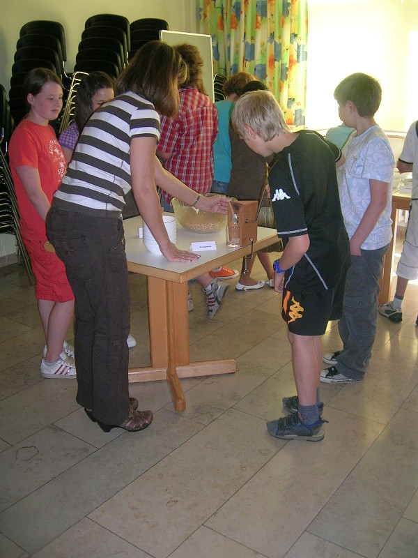 Spielerisch, mit Hilfe des "Zuckerdetektivs", wird aufgezeigt, dass Getränke fit statt dick machen können. Eine Eisteepackung enthält 60 Zuckerwürfel, ein Glas Wasser dagegen keinen Zucker. Danach folgte ein Demonstrationsspiel zur Fragestellung "Wie fühlt sich eine Körperzelle an, die 3 Minuten gearbeitet hat?". Unsere Schüler führten Bewegungsübungen als Herz, Lunge, Muskel, Nervenfasern und Blut aus. Das Aufzeigen einer gesunden Ernährungsweise erfolgte nach dem Besprechen der Ernährungspyramide durch Zubereitung eines Müslis nach eigenen Vorstellungen. Eine Getreidekornquetsche stand zur Verfügung. Anschließend wurden mit Hilfe zweier Kurzfilme verschiedene Formen von Essstörungen besprochen. Am Ende der Veranstaltung erhielt jedes Kind eine Papiertragetasche mit Ernährungstipps und einem kleinen "gesunden" Snack.