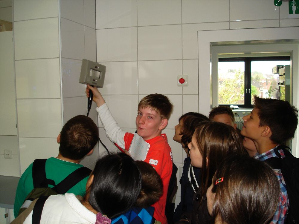 Dann gingen wir in den 6. Stock. Die andere Gruppe tauschte also mit uns. Als wir mit großer Mühe oben ankamen, kam uns Herr Emlich entgegen. Bei ihm lernten wir, wie man einen Finger- und Fußabdruck sichern kann. Wir sicherten die Fingerabdrücke zweier Schüler. Mit UV- Licht kann man unsichtbare Schriften sichtbar machen.