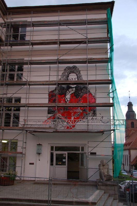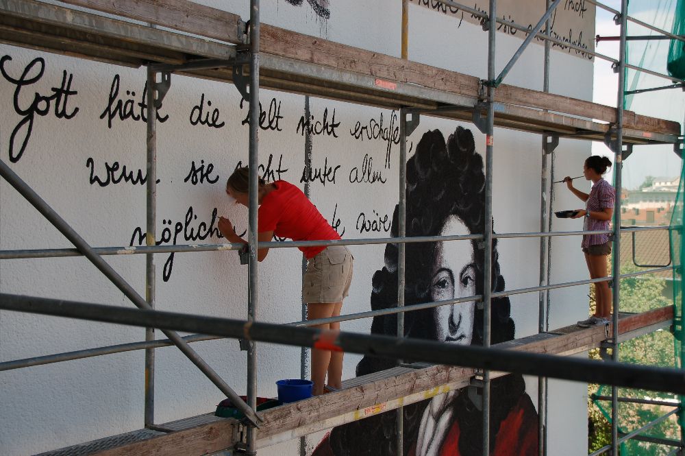 Zu Beginn der Sommerferien kündete ein Gerüst von einem neuen Blickfang für das Leibniz: Von der Künstlerin Marie Gouil wurde die Fassade im Bereich des Eingangs durch ein riesiges Gemälde zu einem weithin sichtbaren Anziehungspunkt. Frau Gouil ist an unserer Schule als Lehrerin für Bildende Kunst tätig und hat u.a. in Kaiserslautern schon ähnliche Fassaden gestaltet. Auf Anfrage war sie direkt bereit, auch das "Leibniz" mit ihrer Kunst zu verschönern. Die Stadt Pirmasens konnte für das Projekt gewonnen werden und steuerte Gerüst und Farbe bei.