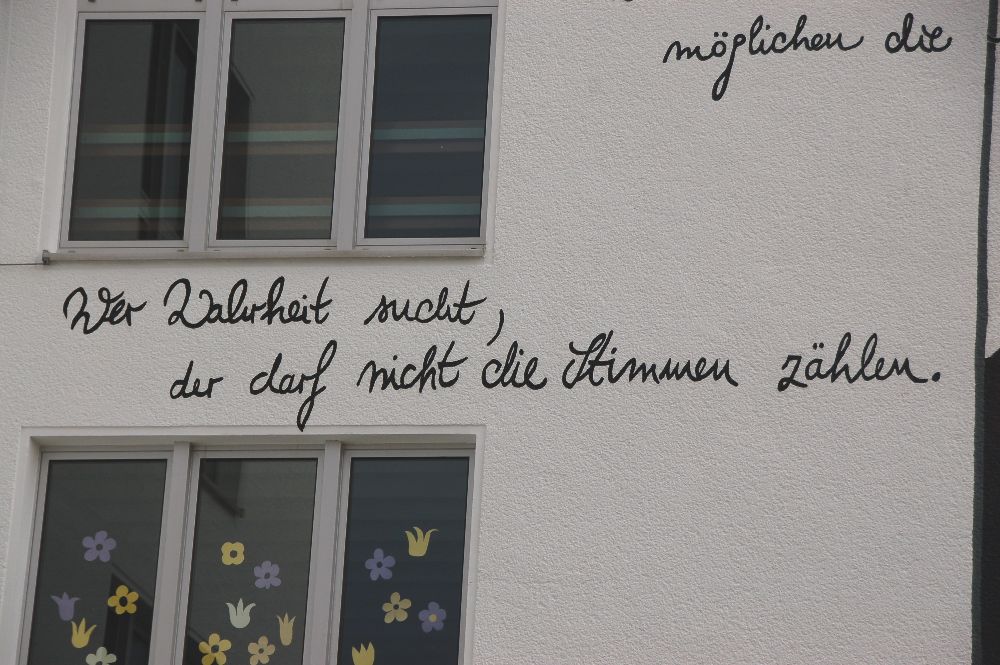 Zentrales Objekt ist (natürlich) das Porträt des Namensgebers der Schule, von dem auch die Zitate an der Wand stammen. Die Vorlage der Künstlerin wurde mit Hilfe eines starken Beamers in zwei Nachtschichten an die Wand übertragen und dort in akribischer Kleinarbeit ausgestaltet. Die Feinarbeit übernahm reine "Frauenpower" auf dem Gerüst - die Künstlerin wurde unermüdlich unterstützt von Kolleginnen (Frau Breum, Frau Schilling, Frau Schmitt, Frau Weilbach-Pieters) und Freundinnen.