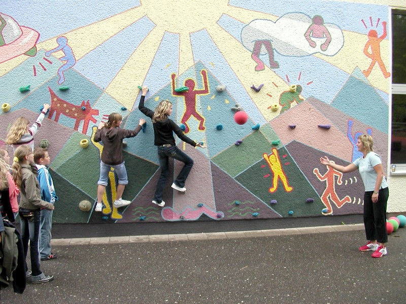 Etwa 2 Jahre dauerte es von der Idee bis zur Fertigstellung der neuen Kletterwand im Schulhof. Sicherheitsaspekte waren zu bedenken und technische Schwierigkeiten bei der Anbringung der Griffschalen an der Hauswand waren zu bewältigen. Manches Bohrloch erwies sich als falsch gesetzt, bis die Griffe schließlich in der richtigen Höhe mit Dübeln befestigt waren. Die Hausfassade wurde von einer Arbeitsgemeinschaft unter Leitung von Herrn Repp mit Motiven gestaltet und bemalt. Die Finanzierung lief verhältnismäßig unkompliziert. Die rund 2000 Euro an Kosten brachten der "Verein der Freunde des LGP" und die Schülervertretung auf.