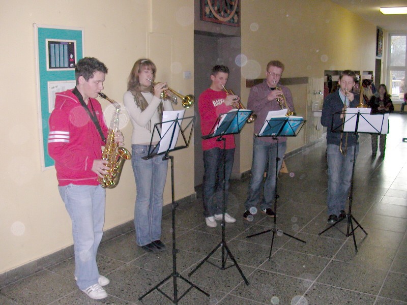 Frau Vehling und ein improvisiertes Bläserquintett überraschten am letzten Schultag vor den Weihnachtsferien die in die Pause strömenden Schüler(innen) mit Weihnachtsliedern. Die 10. Klasse bot Punsch an.
