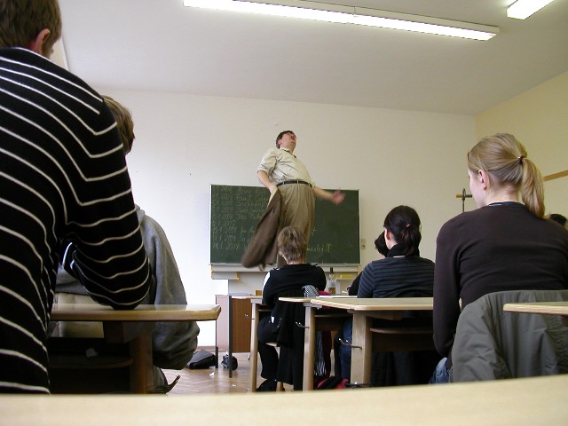 Am 15.01.08 führte das Pfalztheater Kaiserslautern in den Räumen des Leibniz-Gymnasiums für drei Deutschkurse der Stufen 11 und 12 "Klamms Krieg" auf. Das sehr emotionale Lehrer - Schüler - Drama behandelt den Konflikt zwischen dem paranoiden Deutschlehrer Klamm und seinem Leistungskurs, der ihm den Krieg erklärt, weil sie ihm die Schuld am Selbstmord eines Schüler des Abiturjahrgangs zuweisen. Dieser erhängte sich, nachdem Klamm ihn durch Verweigerung eines dringend benötigten MSS - Punkts durchs Abitur fallen ließ. Im Laufe des Stückes - die Inaktivität seines Kurses trug unter anderem dazu bei - bekam er immer mehr Schuldgefühle und dadurch veränderte sich sein Charakter von streng und autoritär zu hilflos und labil. Letztendlich trieb ihn dies in den Selbstmord. Das Ein-Personen-Stück beeindruckte die Zuschauer sehr, da sie als Schulklasse selbst in das Stück mit einbezogen wurden. Im anschließenden Gespräch mit dem Darsteller und der Theaterpädagogin interpretierten sie ihr Stück als durchaus realitätsnah. Die Kurse verließen nachdenklich diese Veranstaltung.