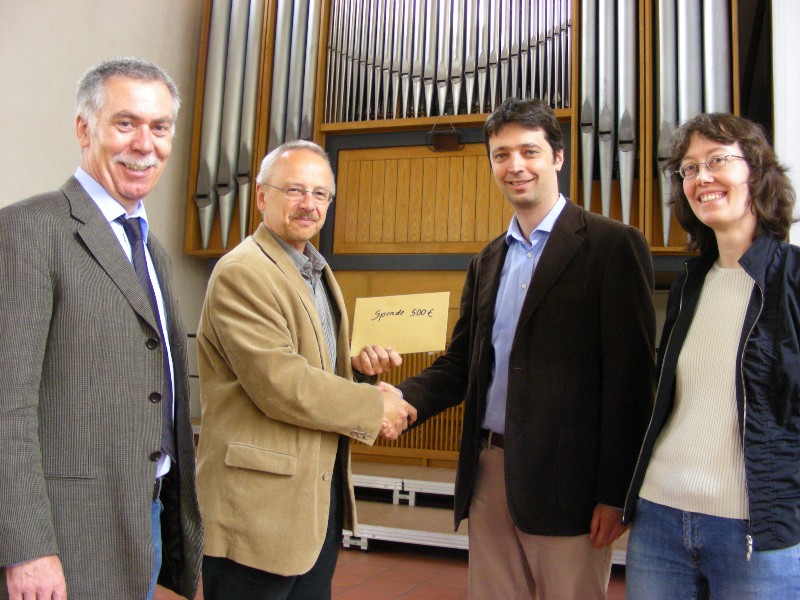 Als Beitrag zur Renovierung der Orgel der Johanneskirche überreichten die Fachschaft Musik, vertreten durch Herrn Konrath und Frau Vehling, und Schulleiter Dieter Kallenbach an Pfarrer Bernd Rapp 500 €.