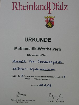 Auch bei der aktuellen Runde des seit 1989 bestehenden alljährlichen Mathematikwettbewerbs von Rheinland-Pfalz war eine Schülerin des Leibniz-Gymnasiums erfolgreich. Wir gratulieren Hasmik Ter-Tovmasyan aus der Klasse 8c zu einem 1. Preis in der 1. Runde. Sie konnte in diesen Tagen eine Urkunde aus den Händen von Frau Geßner in Empfang nehmen, die im Haus den Wettbewerb betreut. Zu bearbeiten waren in einer Klausur am 08.11.07 fünf Aufgaben.