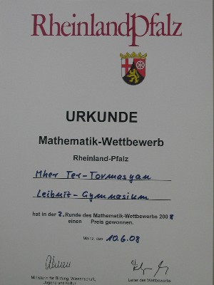 Die Geschwister Hasmik und Mher Ter-Tovmasyan qualifizierten sich im letzten Schuljahr als Beste ihrer Jahrgangsstufe für die zweite Runde des Bundeswettbewerbs Mathematik. Die Aufgaben in dieser Runde sind deutlich schwerer und müssen als eigenständige Leistung innerhalb von zwei Monaten gelöst werden. Beide Teilnehmer schnitten auch in dieser Runde als Beste so erfolgreich ab, dass sie nach Kaiserslautern zu einem einstündigen Kolloquium eingeladen wurden. Auf der Grundlage dieser Gespräche werden die Bundessieger ausgewählt. Den Bundessiegern winkt ein Stipendium an einer wissenschaftlichen oder technischen Hochschule.