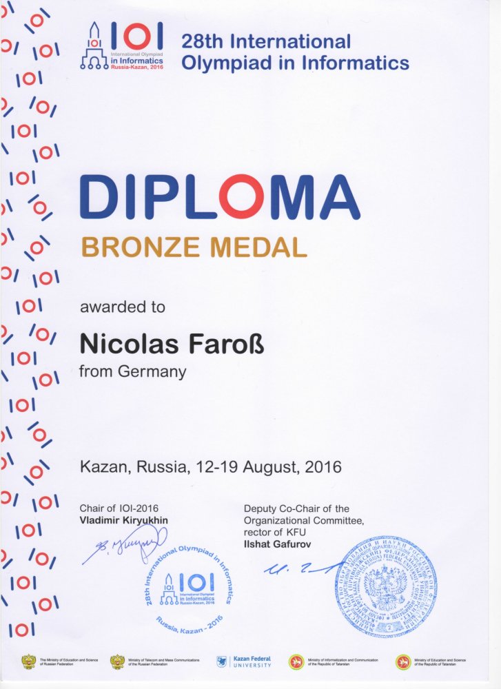 Im August belegt Nicolas einen 3. Platz bei der 28. internationalen Informatik Olympiade (IOI) in Kazan (Russland). Er war damit bester deutscher Teilnehmer bei diesem sehr renommierten und gut besetzten Turnier.
