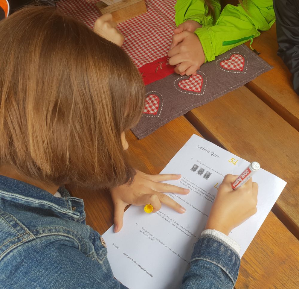 Am Ende gewann die 5D mit der Klassenleiterin Frau Klimmer-Fitting eine große Tüte Haribo-Gummibärchen für die ganze Klasse und eigene Leibniz-Armbänder für jeden Schüler.