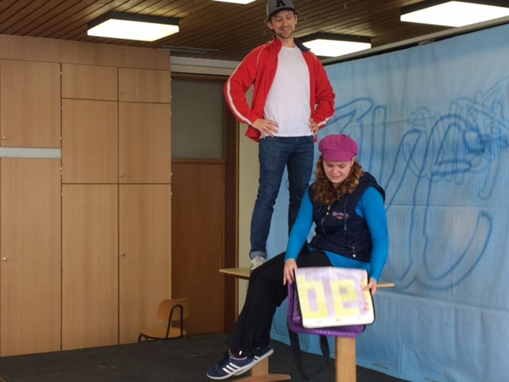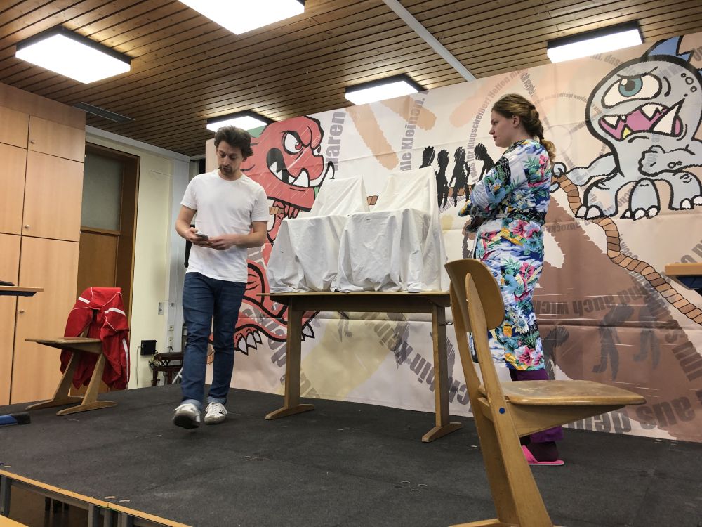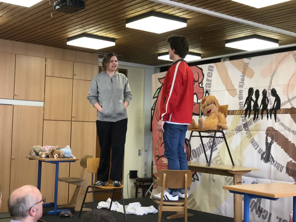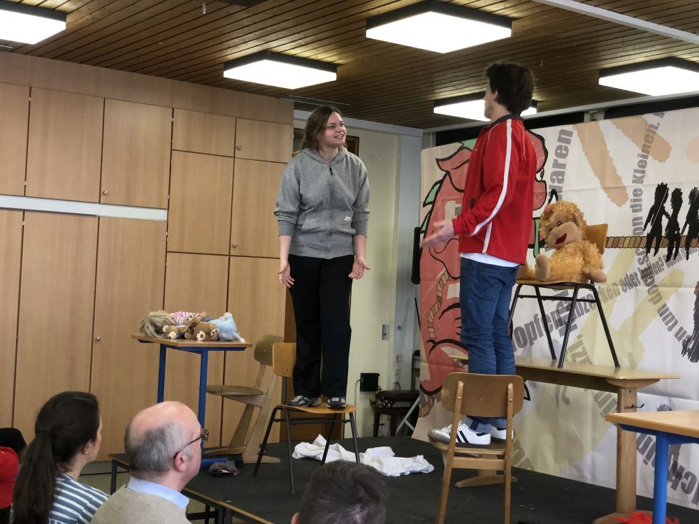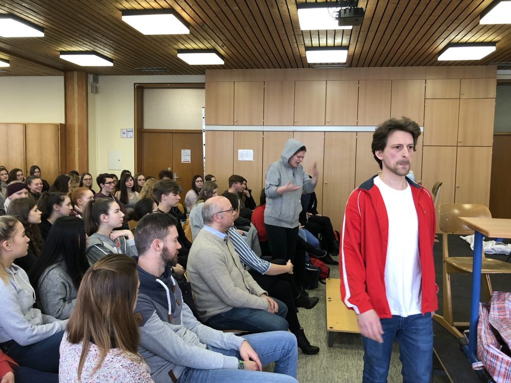 Vor den Schülern der Stufen 10 und 11 führte das Theaterensemble das sozialkritische Theaterstück "Wir waren mal Freunde" von Karl Koch auf, in dem die Auswirkungen von Rassismus und Fremdenfeindlichkeit am Beispiel einer früheren Freundesclique anschaulich verdeutlicht wurden. Die beiden Schauspieler Marie Beiderwellen und Philipp Bodner stellten die verschiedenen Figuren überzeugend dar und gestalteten das im Stil einer Kriminalgeschichte dargebotene Geschehen sehr lebendig und authentisch.