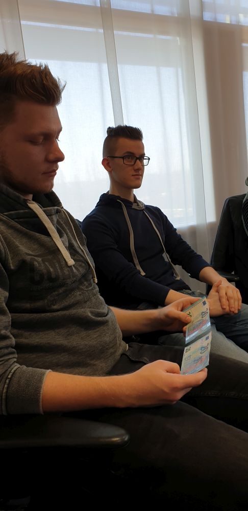 Der erste Vortrag behandelte das Thema „Falschgeld". Hierbei wurde nicht nur deutlich, dass der 50€-Schein der mit Abstand meistgefälschte ist. Auch wurde ausführlich erklärt, wie man eine gefälschte Banknote erkennt und was man tun sollte, falls man solch einen Schein entdeckt. Dabei konnte man auch gefälschte Banknoten begutachten und diese mit echten vergleichen. Besonders eingegangen wurde hier auf die spezifischen Sicherheitsmerkmale, durch die die Banknoten immer fälschungssicherer gemacht werden.
