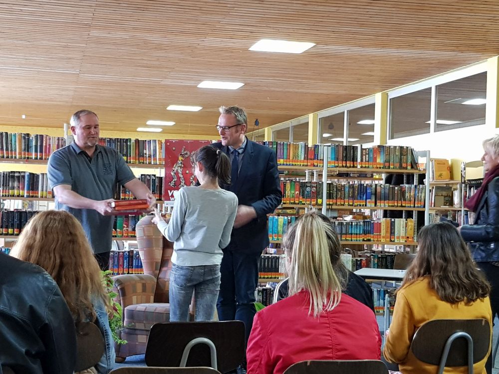 Mit ihrem Vortrag aus "Auf immer gejagt" von Erin Summerhill und einem ebenso souveränen Lesen des unbekannten Textes überzeugte Emely die Jury, die sich aus Vertretern der Stadtbücherei, Rheinpfalz, Thalia, Amt für Jugend & Soziales und Bürgermeister Markus Zwick zusammensetzte und gewann den 1.Platz.