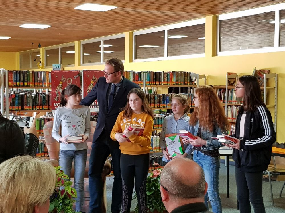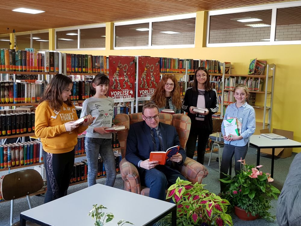 Die fünf Siegerinnen der 6. Klassen der weiterführenden Schulen (Hugo-Ball-Gymnasium, Immanuel-Kant-Gymnasium, Leibniz-Gymnasium, Landgraf-Ludwig-Realschule Plus, Realschule Plus Kirchberg) trafen sich in der Zweigstelle der Stadtbücherei an der Realschule Plus Kirchberg. Jede Teilnehmerin las jeweils drei Minuten aus einem selbstgewählten Buch, dann eine nicht vorbereitete Textstelle.