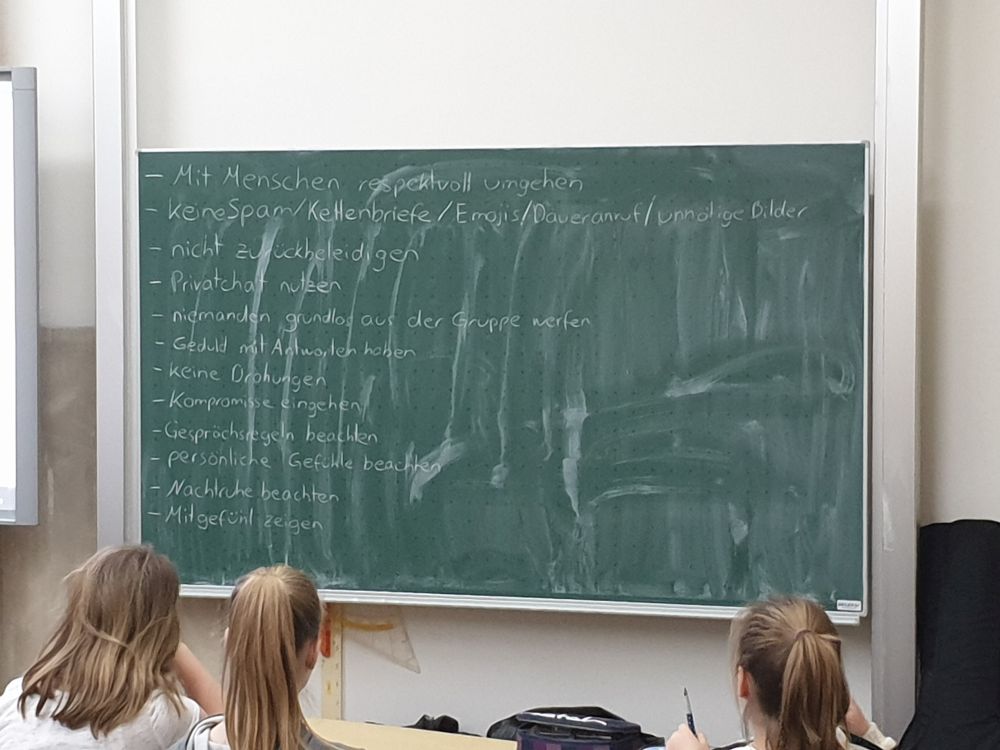 In vier Gruppen aufgeteilt wurden jeweils zwei sechste Klassen in der 1.-3. Stunde und später der 4.-6. Stunde zum Thema Cyber Mobbing unterrichtet. Die Schüler hatten teilweise schon viele Erfahrungen gesammelt, von welchen sie uns gerne berichteten und waren mit Interesse bei der Sache. Immer wieder fiel uns auf, dass dieses Thema gerade bei den jüngeren Klassen ein aktuelles Thema ist, weshalb wir zum Schluss mit den Schülern eine Liste mit ,,Chatiquette- Regeln", also dem richtigen Umgang miteinander in den sozialen Medien, aufstellten. Auch hier hatten die Schüler sehr gute Beiträge zu leisten und nach einer abschließenden Abstimmung einigten sie sich schnell auf eine Liste der wichtigsten Regeln. Zum Schluss stellten wir den Schülern noch eine App vor, auf welcher sie viele hilfreiche Tips zum Thema Cyber Mobbing, aber auch Kontaktdaten von anonymen Anlaufstellen finden können, sollten sie sich nicht an Eltern/Familie oder uns Medienscouts wenden wollen.