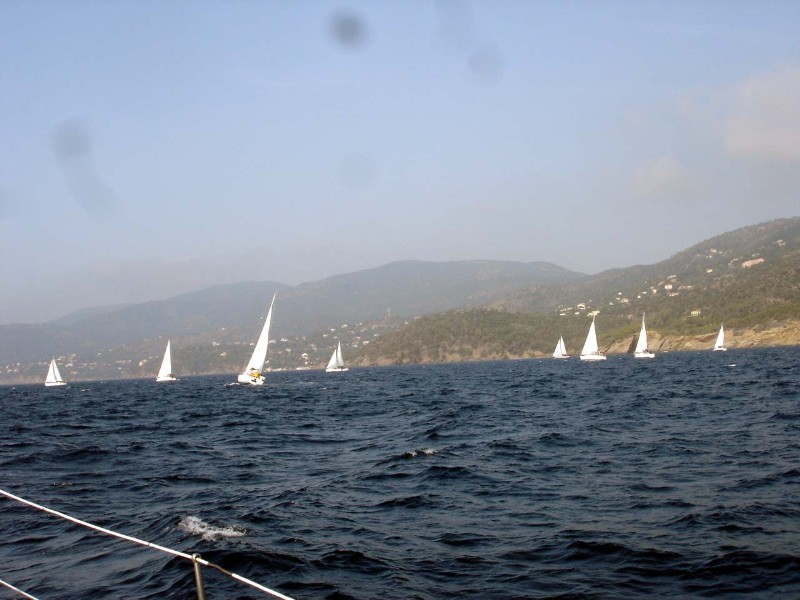 Ab der Wochenmitte wurde bei herrlichem Herbstwetter, das uns übrigens die gesamte Zeit begleitete, der Wind wieder von Tag zu Tag stärker. Nach der vierten Etappe mit Zielhafen Cavalaire, führte uns die Schlussetappe auf einem Dreieckskurs wieder zurück nach Bormes les Mimosas. Die kleine Felseninsel "La Formique", die dabei als Wendepunkt diente, war inzwischen für alle Teilnehmer eine gute Bekannte. Schon bei der ersten Tagesetappe musste dieser Punkt umrundet werden. Bei der Etappe des Vortages nach Cavalaire bildete aus Süden kommend die Peillinie 50° auf diese Felseninsel das Ziel. Über Funkkanal 69 bestand während der Regatta ständig Kontakt zu den anderen Yachten und zur Regattaleitung, die unter dem Rufnamen P(apa) F(oxtrott) C(harlie) erreichbar war. Die Funksprüche sorgten dabei durchaus manchmal für Erheiterung bei den anderen Teilnehmern (Beispiel bei der besagten Etappe: Eine Yacht meldet: "Peilen Ziel in 50°, laufen durchs Ziel!" - Antwort Regattaleitung: "Nein! Ich stehe doch dort!", die anderen Teilnehmer hörten amüsiert mit).