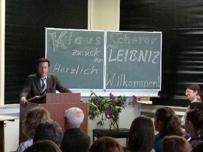"Herzlich Willkommen", so lautet die Aufschrift an der Tafel im überfüllten Musikraum. Klaus Scherer, der vor 30 Jahren (1980) am Leibniz-Gymnasium sein Abitur absolviert hat, kehrt zurück an seine Schule, um Schülern, Lehrern, Elternvertretern und Gästen von seinem Berufsalltag als ARD-Korrespondent in Washington und seinem Weg vom einfachen Mitarbeiter der Pirmasenser Zeitung bis ins ARD-Studio in den USA zu berichten.