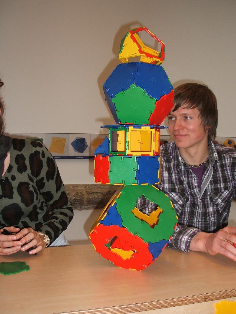 Nach vier Stunden Zugfahrt kamen wir in Gießen an und eilten nach einem kleinen Imbiss weiter zu unserem Ziel: das Mathematikum. Ein Mitarbeiter hielt uns einen kurzen Vortrag über den goldenen Schnitt, wobei jeder von uns an sich selbst prüfen konnte, ob er "Idealmaße" hat. Schließlich erkundeten wir die Ausstellung auf eigene Faust und erklärten uns anhand kurzer vorbereiteter Vorträge gegenseitig einige Exponate. Außerdem bauten wir mit Feuereifer Platonische Körper und eine Leonardobrücke, die aus lauter Holzlatten bestand. Nach diesen langen Stunden voll Mathematik machten wir uns auf die Suche nach unserer Bleibe für die Nacht. Nach einem endlos scheinenden Fußmarsch von der Bushaltestelle aus kamen wir mit Sack und Pack an. Nachdem wir unser Quartier bezogen hatten, machten wir uns auf den Weg ins "Dachcafé" von wo aus man einen tollen Blick über Gießen bei Nacht hatte.