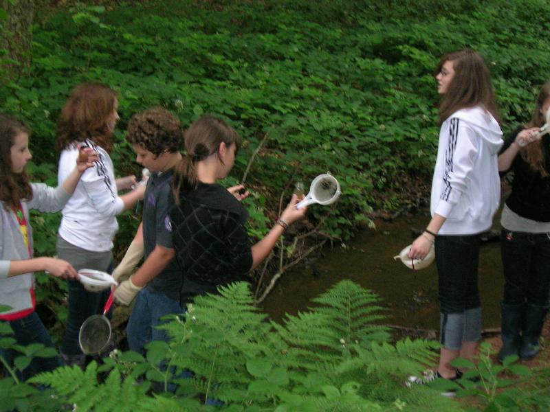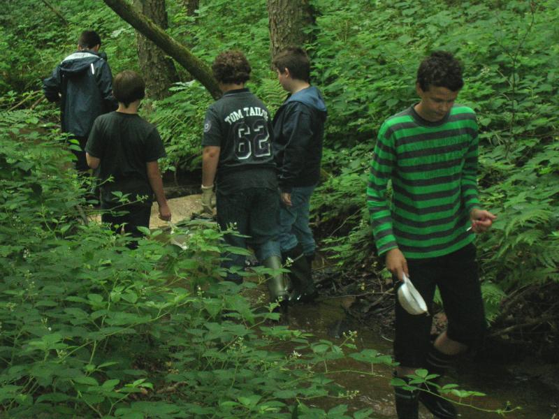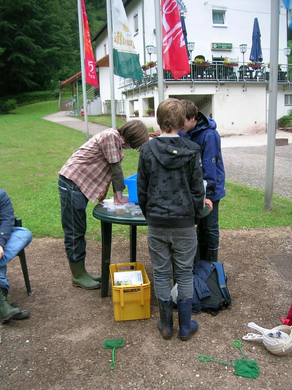 Die Gewässerexkursionen fanden in Niedersimten in der Nähe des Naturfreundehauses statt. Dort wurde ein kleines Fließgewässer untersucht. Mit Hilfe der sogenannten Zeigerorganismen, z.B Eintagsfliegenlarven, Steinfliegenlarven, Köcherfliegenlarven, Flohkrebse und Flusskrebse konnte die Gewässergüteklasse 1 (unbelastet bis gering belastet) ermittelt werden. Nur die Klasse 6c wurde vom Regen überrascht, fand aber Schutz im Naturfreundehaus, in dem sich alle mit einer warmen Mahlzeit stärken konnten.