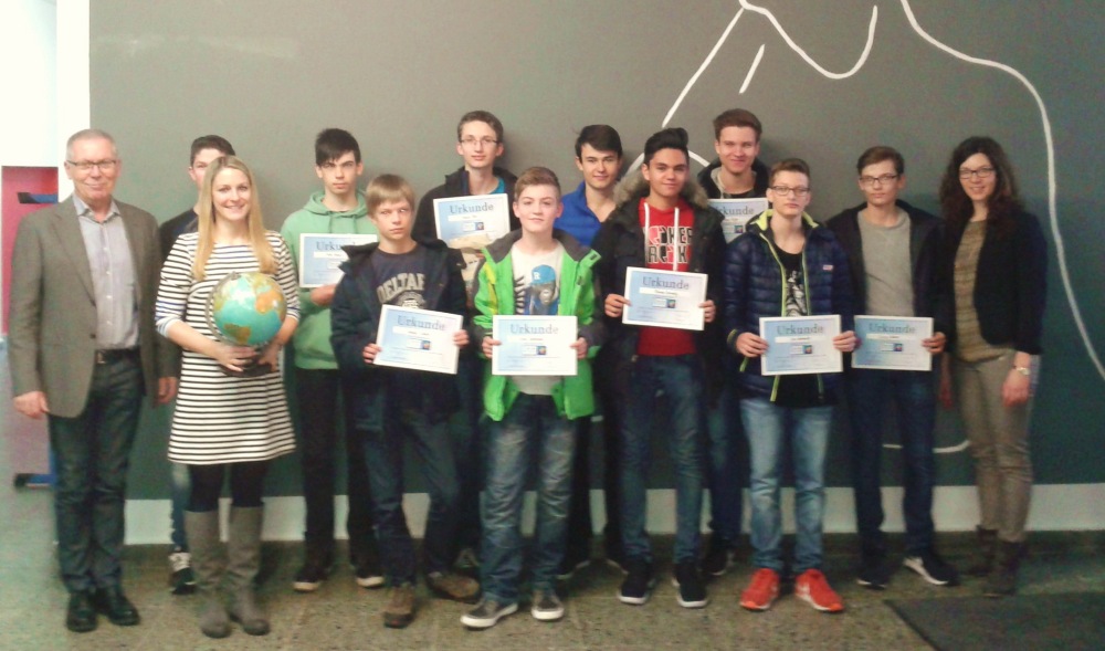 Sieger der Klassenstufe sieben ist nach einer Stichfrage Julian Kobylanski (7b). Die Plätze zwei und drei gehen an Laura Küchler (7a) und Nathan Schmitt (7c). In der achten Jahrgangsstufe belegt Felix Kraus (8a) den ersten Platz. Lucas Kehrer (8c) ist Zweiter und Jan Demmere (8b) Dritter. Jan Gebhardt (9c) bewies ein großes geographisches Wissen beim Wettbewerb und belegt somit den ersten Platz in der Jahrgangsstufe 9. Florian Serwaty (9a) und Marc Häfer (9a) teilen sich den zweiten Platz. In der Klassenstufe 10 siegt Andre Bär (10a). Die Plätze zwei und drei belegen Jan Breiner (10a) und Til Kupper (10a).