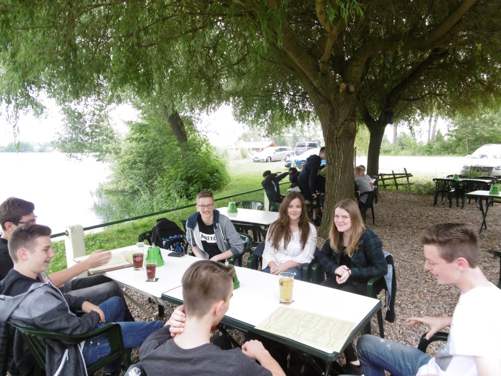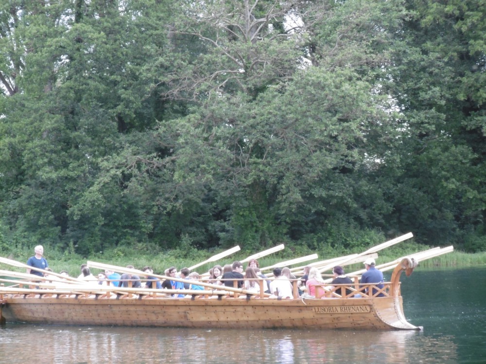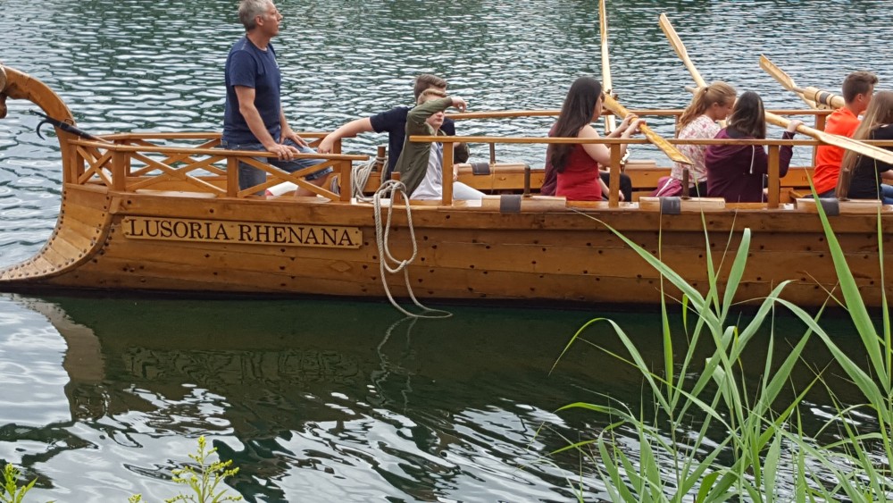 Danach machten wir alle zusammen eine Pause im Anglerheim in Neupotz. Dort gab es leckeres Essen und wir tauschen uns über die verschiedenen Themen aus. Daraufhin ging es dann auch für uns an Bord der Lusoria. Zuerst wurden uns verschiedene Regeln und Ruderarten erklärt. Wir konnten diese auch gleich selbst ausprobieren. Während der doch recht anstrengenden Bootsfahrt wurden verschiedene Herausforderungen an uns gestellt. Zwei Beispiele dafür sind die Fahrt mit verbundenen Augen und das Läuten einer Glocke mithilfe einer Stange, die einer der Betreuer in der Hand hielt. Dort haben wir viel über die Geschichte des römischen Militärs, vor allem der Römerboote und deren Besatzung gelernt.