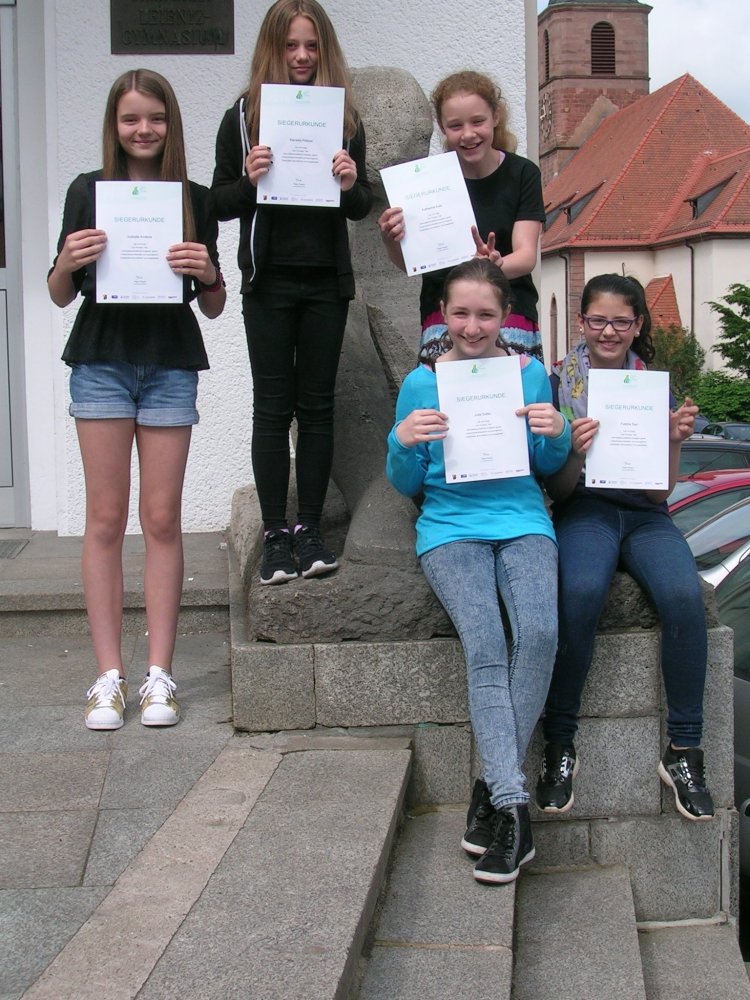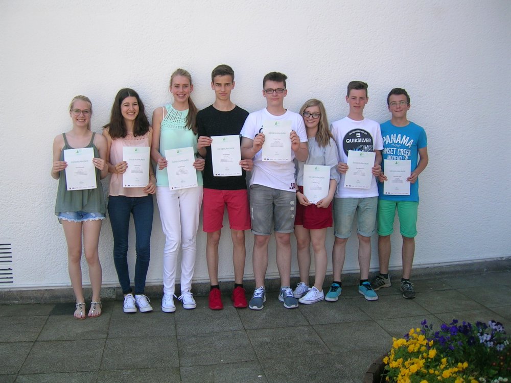 Melissa Eder, Philipp Ewen, Jonathan Freyer, Jule Grewenig, Carolin Guth, Hannah Hoffmann, Isabelle Klein, Rebecca Rohr, Nicole Roos, Lara Schäfer, Raquelle Sutter, Lea Timpe, Michelle Wanner, Louisa Wüstemann (Siegerurkunden). Ehrenurkunden erhielten Michael Graf, Mai-ko Halbig, Hannah Hof, Luc Schmitt und Benjamin Wolfer. Klasse 8b: Max Heringer, Emilie Kern, Claudia Konkel, Lars Müller, An Ton That. - Klasse 8d: