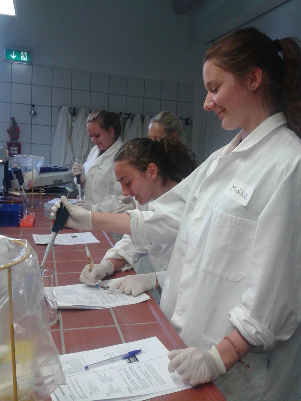 Am Dienstag, den 12.07.2016 konnte der Biologie-Leistungskurs 12 an der Universität Trier einen Praxistag im Labor erleben. Betreut wurde das Praktikum von Mitarbeitern und Wissenschaftlern im Fach Umwelttoxikologie sowie von Frau Sooss. Der Schwerpunkt des Schülerpraktikums lag im Bereich Molekularbiologie und Gentechnik. Die eigene DNA wurde dabei auf den Single Nucleotid Polymorphismus des Gens ALDH2 untersucht. Das Gen ALDH2 codiert für das Enzym Aldehyddehydrogenase (ALDH2), welches u.a. beim Alkoholmetabolismus eine entscheidende Rolle spielt: Alkohol wird zunächst in der Leber durch Alkoholdehydrogenase (ADH2) in toxisches Acetylaldehyd umgewandelt. Anschließend wandelt die Aldehyddehydrogenase (ALDH2) das Zwischenprodukt in Acetat um.