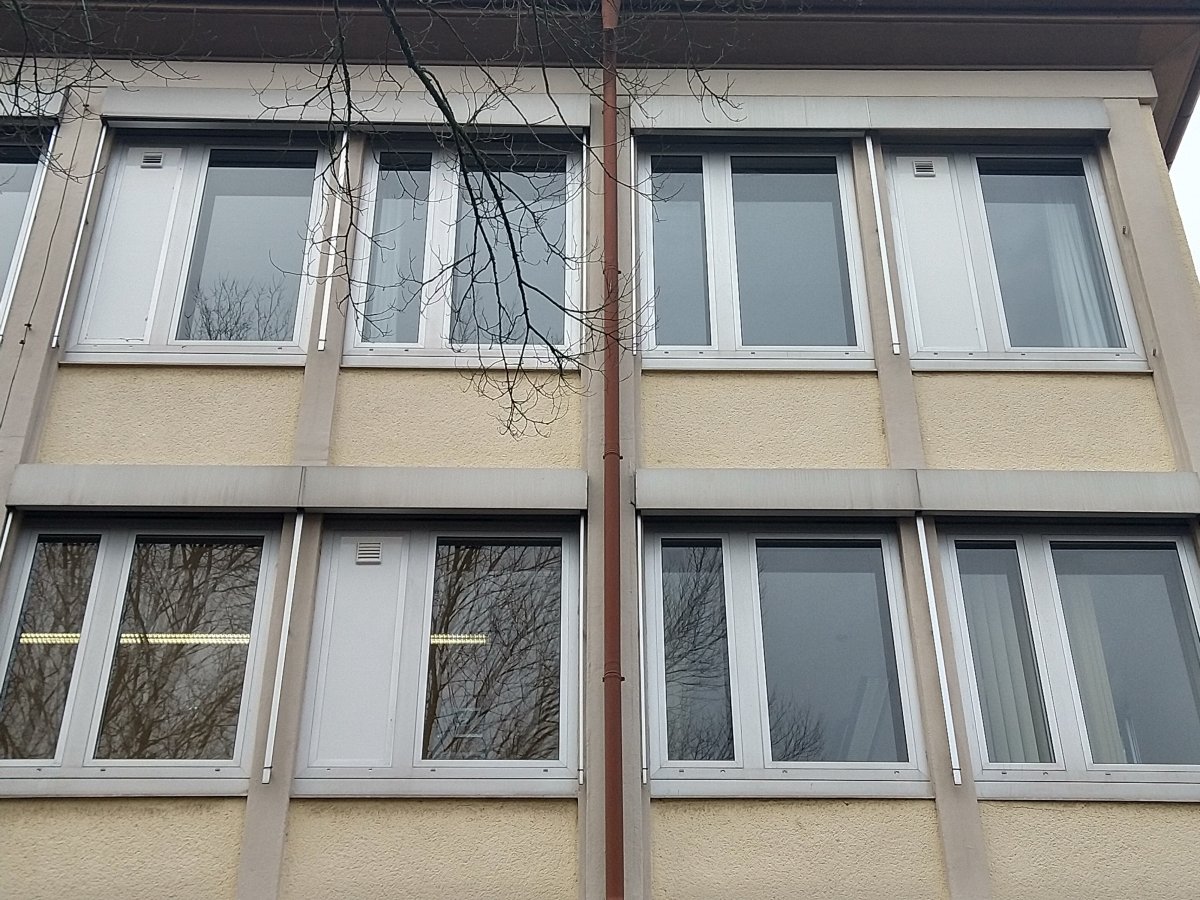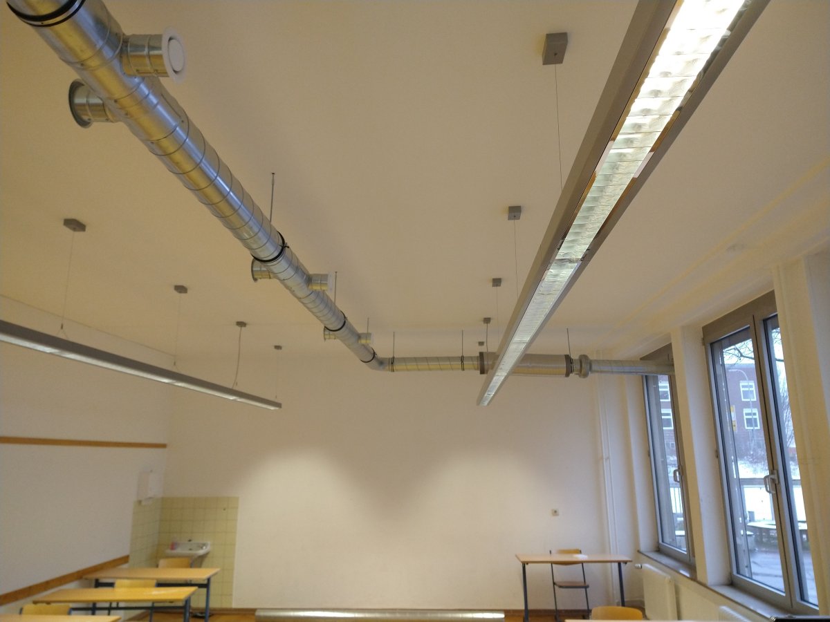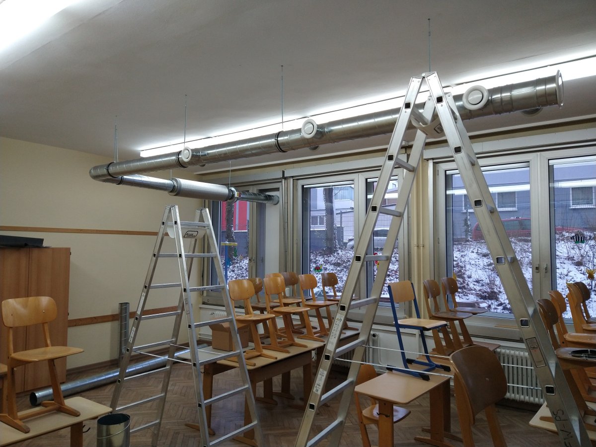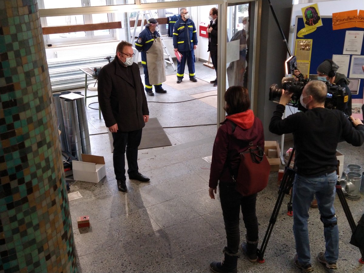 Am Samstag, 23.01.21, kündigte die "Vorhut" des THW schon Großes an: Die ersten Scheiben wurden aus den Fenstern genommen und durch Kunststoffplatten mit Lüftungsdurchlässen ersetzt. So richtig in Fahrt kam das THW dann am Donnerstag, 28.01.21 - schon der Fuhrpark im Schulhof war eindrucksvoll. In unglaublichen insgesamt sieben (!) Arbeitsstunden wurden durch die fleißigen Helfer*innen praktisch alle ca. 40 Schul- und Fachsäle mit Lüftungsanlagen versehen. Die Schule glich einem gut organisierten Ameisenhaufen; an allen Ecken wuselte und werkelte es. Der SWR zu Gast mit Oberbürgermeister Zwick musste sich beeilen, noch einen Saal zum Filmen zu finden, der noch nicht fertiggestellt war.