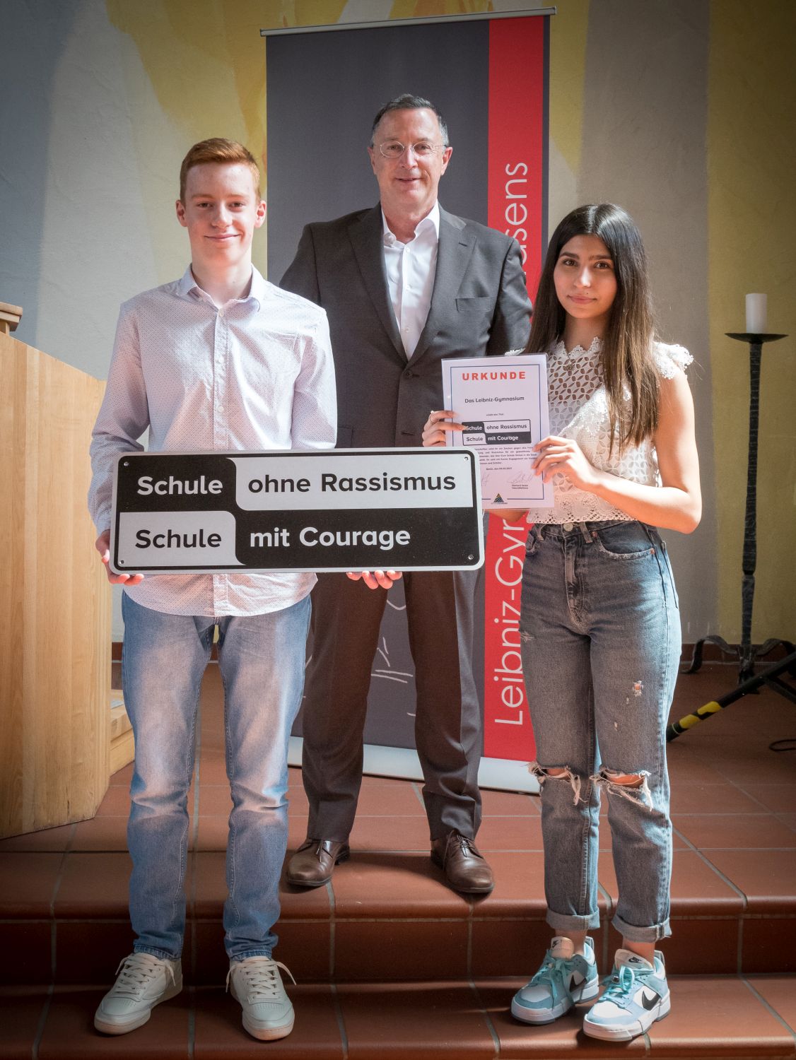 Seit dem 9. Juni 2021 gehört unser Leibniz-Gymnasium dem Netzwerk der rund 3500 „Courage-Schulen" in Deutschland an, denn endlich konnte auch die Plakettenübergabe in einem feierlichen Rahmen stattfinden. Es war bereits der dritte Anlauf, denn Corona machte zuvor eine sichere Feier – die ursprünglich bereits am 2. April 2020 stattfinden sollte – unmöglich.