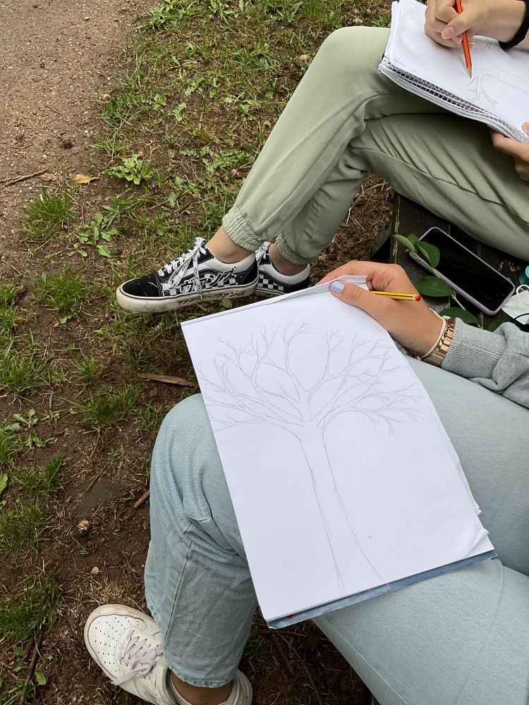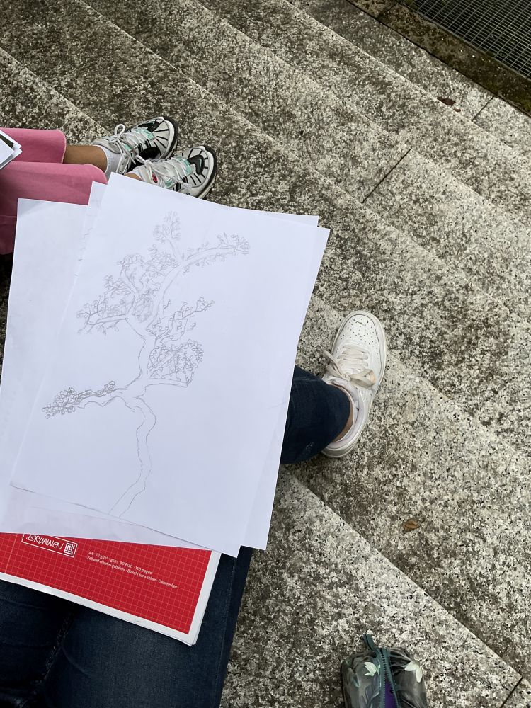 Die Klassen 7c und d beschäftigen sich derzeit mit dem Zeichenmotiv „Baum“. Sie studieren u.a. die natürlich gewachsene Gestalt direkt in der Natur. Auch Details wie beispielsweise Äste, Borken oder Blattwerk werden graphisch untersucht.